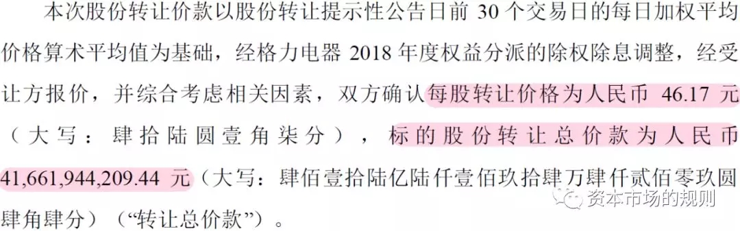 交易的内容是,高瓴资本从珠海国资下属的格力集团手里,收购近10亿(准确为902,359,632)股格力电器股份,每股价格46.17元,金额合计417亿。