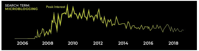 [size=1.1]One example of this phenomenon at work is the adoption of microblogging. Today, we don’t think twice about posting a tweet or updating our status on Facebook, but a decade ago, the act of posting a short public message was major shift in the way people used technology to communicate with one another. The intense buzz that sent microblogging towards the top of the Hype Cycle is corroborated by Google Search data.