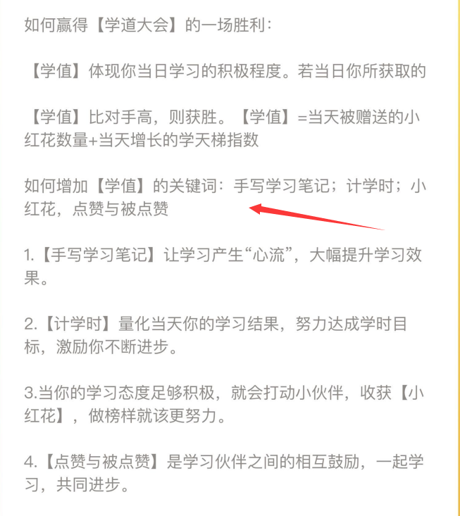 增加学值的关键词:手写笔记,计学时,送小红花与收小红花,点赞与被点赞