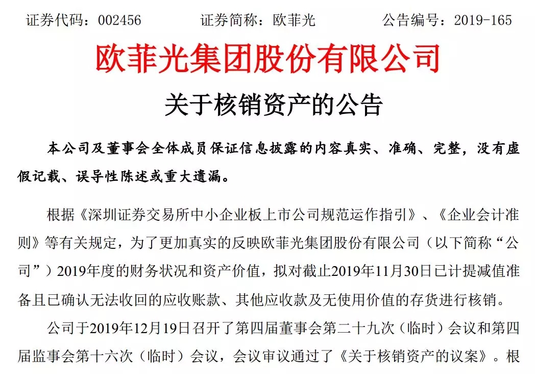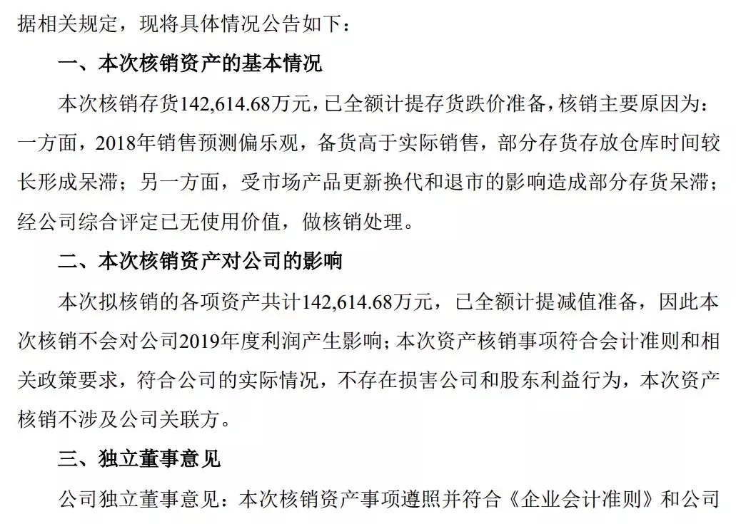 欧菲光公告,核销存货14.26亿元,已全额计提存货跌价准备,核销主要原因为:一方面,2018年销售预测偏乐观,备货高于实际销售,部分存货存放仓库时间较长形成呆滞;另一方面,受市场产品更新换代和退市的影响造成部分存货呆滞;经公司综合评定已无使用价值,做核销处理。