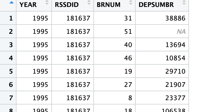 意思就是图片中的第二行N/A填入的是1995年,RSSDID为181637的所有存在的DEPSUMBAR的平均值