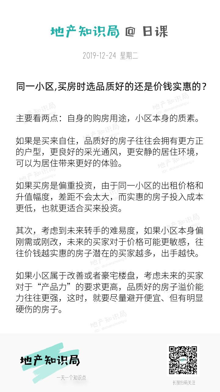 【学习笔记】在买房的时候,同一个小区,是选品质好但贵一些的,还是价格更便 ...