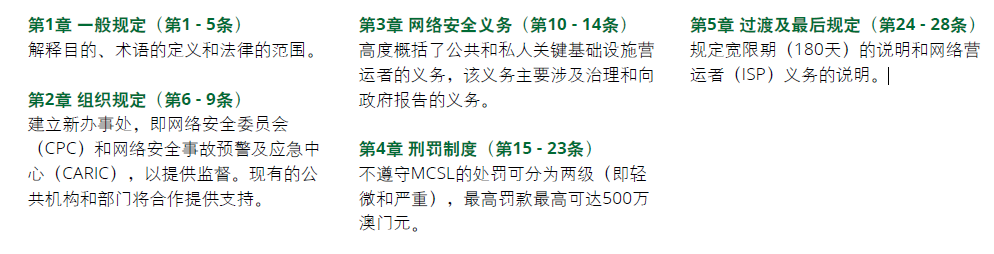 2019年12月22日,澳门网络安全法(“MCSL”)将生效。根据这项法律,不同行业的关键基础设施公共和私人营运者必须履行旨在保护关键基础设施的信息网络和计算器系统的义务。