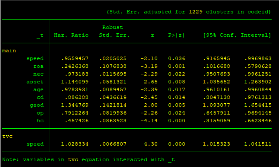 这里tvc一行的speed是本文想重点关注的解释变量,但是它对被解释变量的系数或者风险比要看哪个值啊?