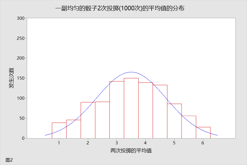 现在假设您将投掷 2 次,并采用两次投掷的平均值。您还将重复此试验 1000 次。让我们来看看两次投掷的平均值的分布。这种分布如图 2 所示。您是否注意到在只进行了两次投掷的情况下,平均值的分布已经呈现出了土堆形?