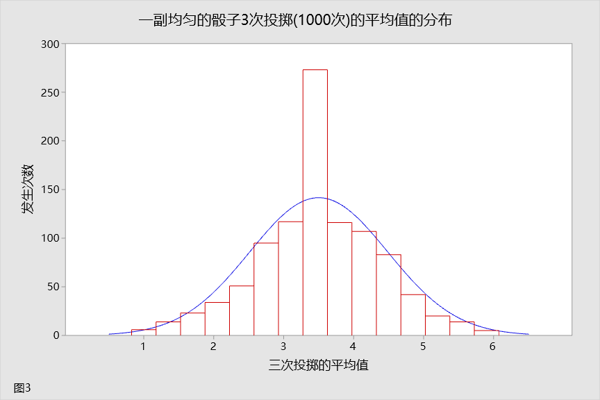 假设您现在投掷骰子三次,然后取三次投掷的平均值。再次重复此试验 1000 次。让我们来看看此举对投掷的平均值分布有何影响。这种分布如图 3 所示。同样,分布的形状与正态分布的形状相当接近。您是否注意到分布上发生了其他变化?