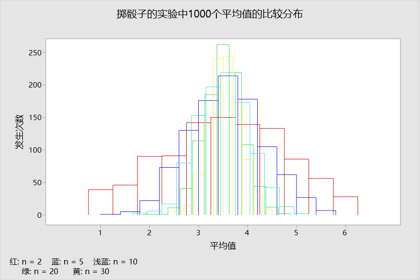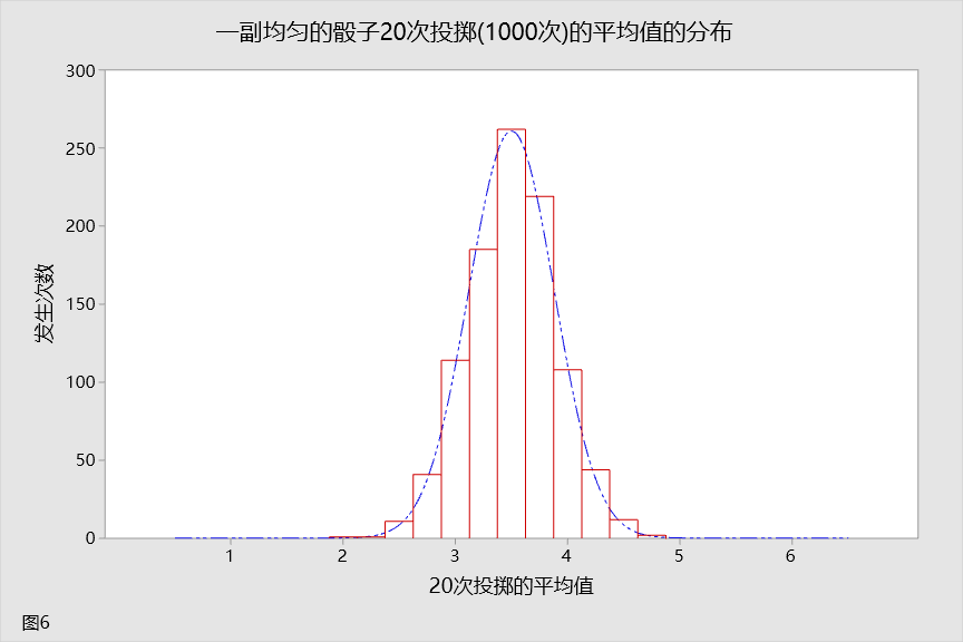 让我们投掷骰子五次,并取其平均值。再次重复此试验 1000 次。这种分布如图 4 所示。您是否已开始注意到所发生的情形中存在任何模式?