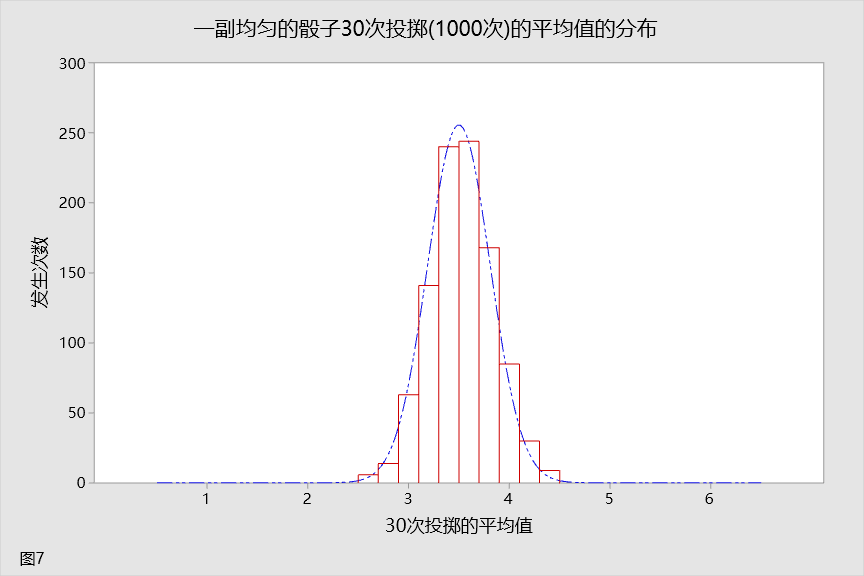到现在,您应该确信增大样本数量对样本平均值分布是有影响的。您将再次增大样本数量,以强化这种认知。此时,您将投掷骰子 30 次。这种分布如图 7 所示。