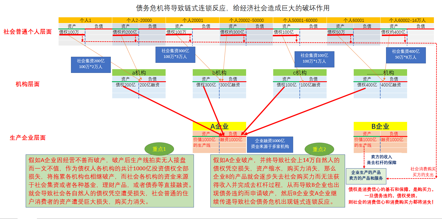 我们再来假想一下,一旦社会债务危机爆发,大量债务违约,那么就一定会导致其债权人的资产快速损失和缩水,从而导致债权人的资产负债表被动增高到100%而爆表破产,债权人也会被拖累破产,然后产生链式反应。