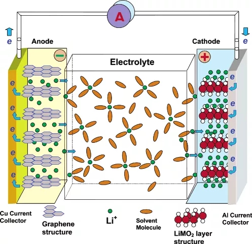 锂离子电池的原理相信大家都已经比较了解了,就是依靠锂离子在正极与负极之间的迁移来存储与释放能量。锂离子的迁移行为酷似摇椅,又被称为“摇椅电池”。充电时,锂离子从正极脱出,经过电解液再嵌入负极的石墨层中,与外电路过来的电子结合;而在放电时,锂离子与电子的运动方向则与充电时相反。