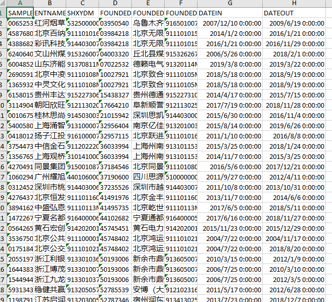 SAMPLE_ID企业ID ENTNAME股东名称 SHXYDM投资企业注册号/统一社会信用代码 FOUNDED_SAMPLE_ID历史被投企业ID FOUNDEDNAME历史被投企业名称 FOUNDEDNAME_SHXYDM注册号/统一社会信用代码 DATEIN进入时间 DATEOUT退出时间