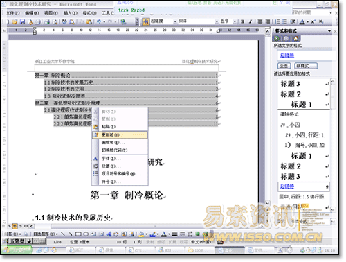 2.出现右边的一条“样式格式”栏,这里面主要就是用到标题1,标题2,标题3。把标题1,标题2,标题3分别应用到文中各个章节的标题上。例如:文中的“第一章 制冷概论”我们就需要用标题1定义。而“1.1制冷技术的发展历史”就用标题2定义。如果有1.1.1×××那就用标题3来定义。