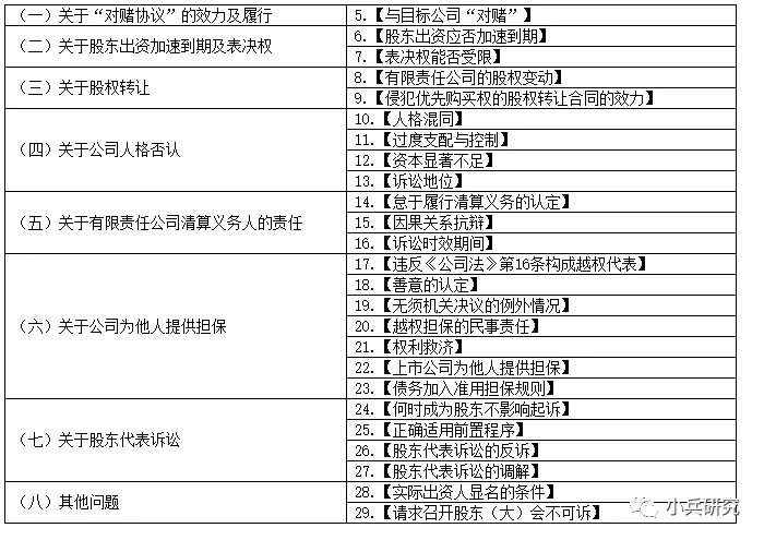 本次九民纪要的公司纠纷部分,总共谈及了八个大点、二十五个小点的内容,具体如下: