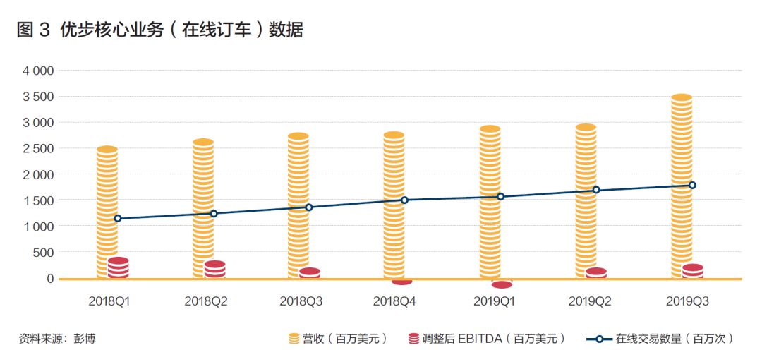 从上述估值模式可以看出,在一级市场,投资人更为关注企业的成长速度,并且对未来的成长模式有很强的主观性判断。如果从这个估值逻辑出发,我们看优步在线订车的数据(图 3),2018年一季度,优步在线订车业务收入达到25.4亿美元,处理在线订单11.3亿次。而到2019年三季度,优步的订车业务收入达到35.5亿美元的规模,处理在线订单17.7亿次,不到1年时间,两项指标增幅分别达到39%和55%。