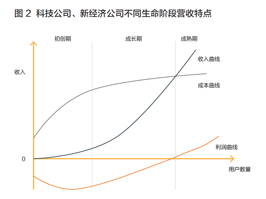 科技公司的营收特点是,企业未来的商业模式和技术路线不甚清晰,在前期需要投入大量的基础研发工作,成本投入巨大,而几乎没有营业收入。以网络经济为代表的新经济公司,其价值创造高度依赖用户数量,因此公司在早期市场推广付费巨大,甚至采用高额补贴的方式获取用户,这造成了新经济公司在生命周期的早期阶段难以产生利润(图 2)。