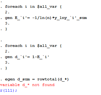 肉丝肉丝 发表于 2021-4-15 18:02 你好,请问运行 egen d_sum = rowtotal(d_*) foreach i in $all_var {
