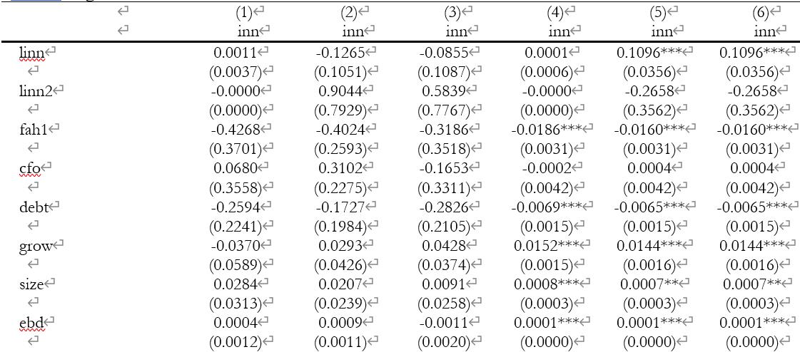 (4)~(6)是为了对照,使用相同的变量但利用混合OLS回归。可以看到 (5)l.inn linn2和(6)c.(l.inn)##c.(l.inn)结果相同。