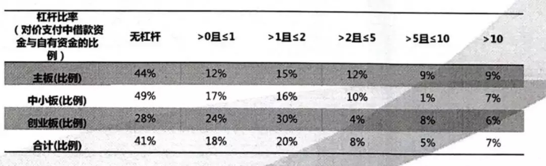 统计显示,杠杆比率超过5的公司,重组完成后平均资产负债率从26.62%增加至55.07%;收购资金全部来来源于借款的公司,平均资产负债率从31.60%加至60.11%。