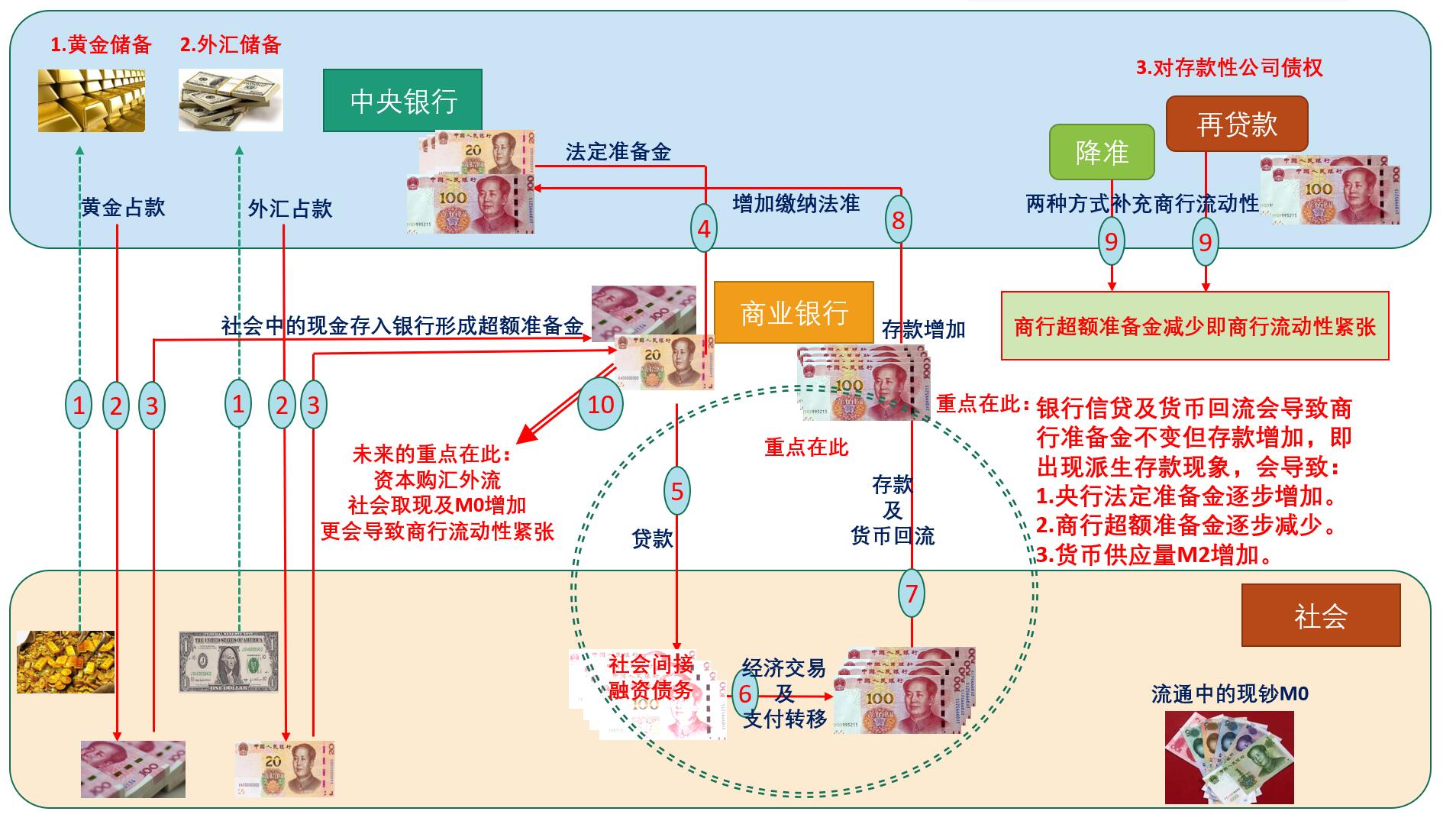 理性的思考会告诉我们,银行降准,或者是再贷款这2种货币现象,都不会直接导致社会中的M0增加,也不会直接导致银行的存款增加。