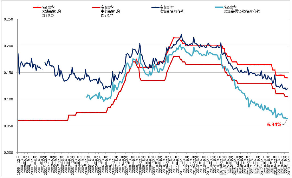 推演的趋势,我以前反复分析过了,就是商行体系内的准备金相对稳定不变化,但是信贷派生存款导致各项存款存款增加。因此商行体系内的实际准备金率=准备金/各项存款=N%是不断走低的。