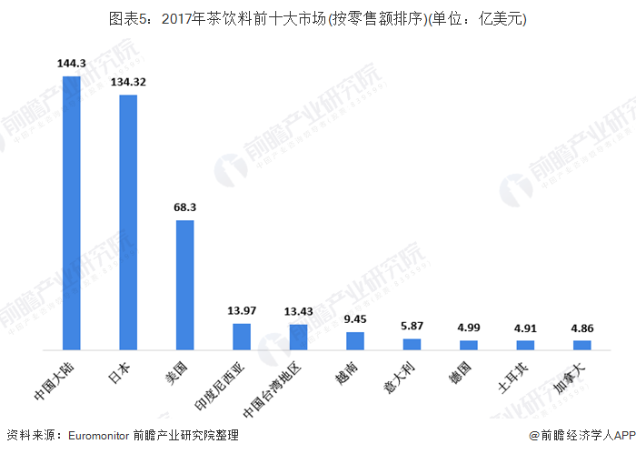 据市场调查公司欧睿国际的最新研究,2017年国际上前十大茶饮料销售国家和地区的茶饮料销售额达到404.40亿美元。亚洲是全球即饮茶市场的中心,亚太地区即饮茶消费占全球72%的份额。其中,中国是世界上最大的茶饮料生产国和消费国,2017年茶饮料消费额达到144.3亿美元;其次是日本,2017年茶饮料消费额达到134.32亿美元。