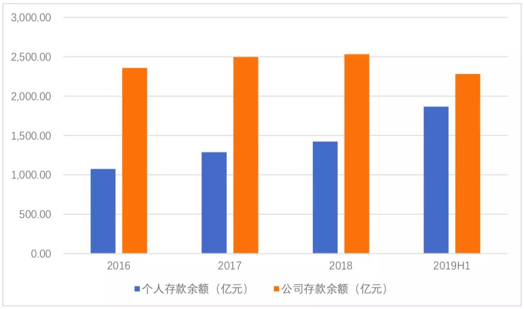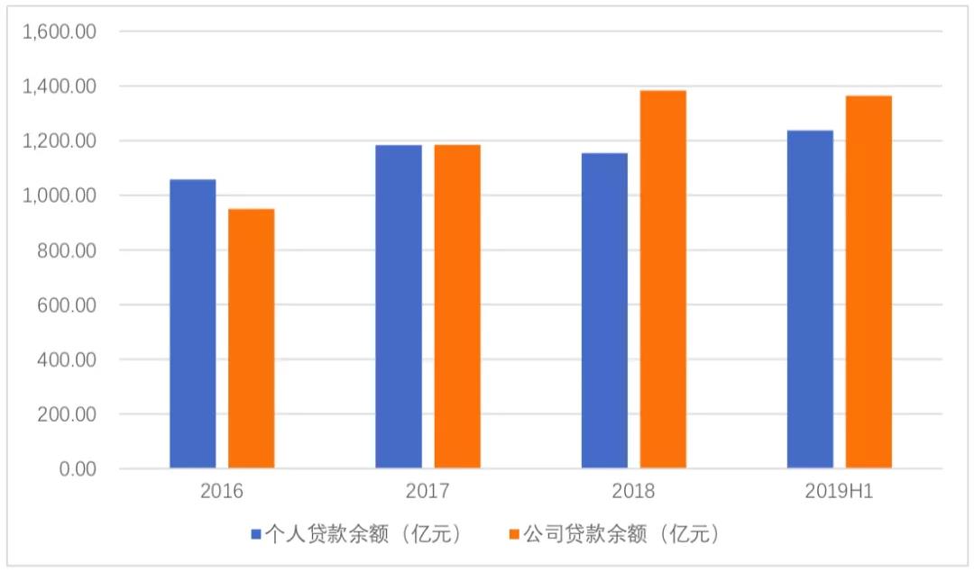2019年二季度末,哈尔滨银行(合并口径)实现个人存款余额1866.36亿元,公司存款余额2280.07亿元,分别同比上升42.93%和下降5.01%;个人贷款余额1237.64亿元,公司贷款余额1364.22亿元,分别同比上升8.82%和0.88%。