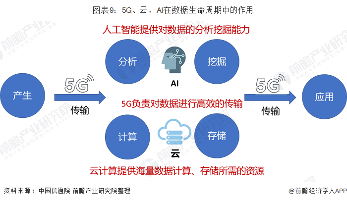 数据经济时代的核心资源是数据,在数据产生、传输、存储、计算、分析和应用的整个生命周期中,5G、云和AI相互融合,形成了数字经济新时代从终端、边缘到中央云的一体化生产工具。5G负责对数据进行高效地传输,云负责对数据进行计算和存储,AI负责对数据进行分析和挖掘。5G、云和AI的技术融合“精炼”出数据更多的应用价值,以数字溢出的形式加速企业、行业以及供应链等不同层面生产力的提升,成为推动经济增长的引擎。