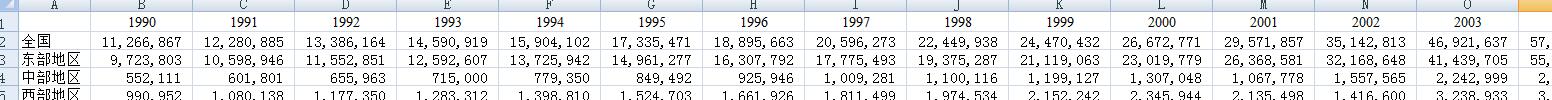 | 上海 | 1,323,291 | 1,442,388 | 1,572,203 | 1,713,701 | 1,867,934 | 2,036,048 | 2,219,292 | 2,419,028 | 2,636,741 | 2,874,048 | 3,132,712 | 5,658,262 | 6,790,753 | 5,430,952 | 8,307,846 | 12,260,003 | 15,010,058 | 14,490,276 | 16,597,523 | 12,291,903 | 11,761,955 | 9,957,527 | 8,484,068 | 7,950,113 | 9,462,702 | 10,354,216 | 11,463,989 | 11,760,238 | 12,818,659 | 13,972,339 |
