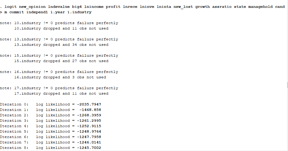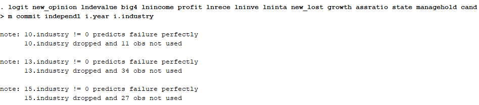 18202272581 发表于 2020-1-12 20:17 各位老师,请问有人知道logit回归中如何同时控制年份和行业吗?我输入图片中的命令,但显示的应该是不对的 ...