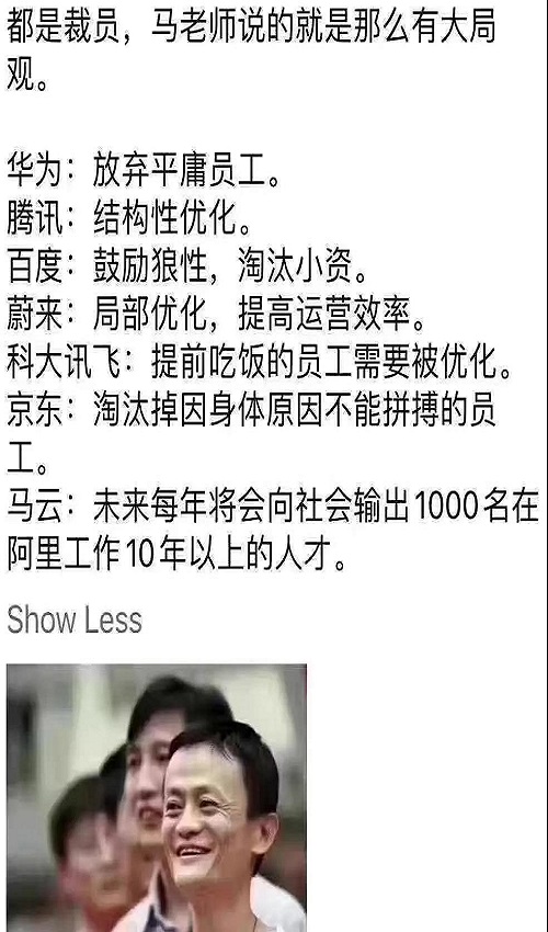 其他说法不能不说不聪明,但都是在粉饰淡化,让裁员看起来不那么难看。但只有马云完全站在了另一个角度,愣是把坏事说成好事。