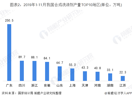 从合成洗涤剂产量的地区分布情况来看,我国合成洗涤剂主要生产地区为广东省。2019年,我国广东省合成洗涤剂产量达250.5万吨。