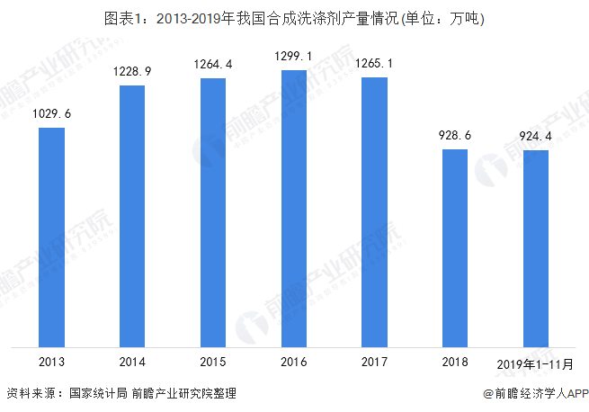 合成洗涤剂是指由合成的表面活性剂和辅助组分混合而成的具有洗涤功能的复配制品。2013-2018年,我国合成洗涤剂产量波动变化,据国家统计局数据显示,2018年,我国合成洗涤剂产量为928.6万吨,2019年1-11月,我国合成洗涤剂产量为924.4万吨。