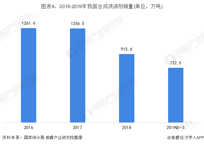 2016-2018年,我国合成洗涤剂销量持续下滑。2018年,我国合成洗涤剂销量为915.6万吨,2019年前三季度,我国合成洗涤剂销量为732.5万吨。