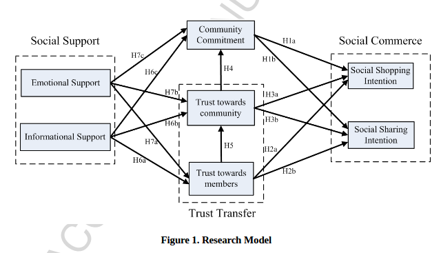 情感支持通常是指提供移情、关心、关心、爱、理解或鼓励,让接受者感到自己是有价值的。与信息支持相比,它更强调社会支持的情感方面,并可能有助于间接克服这些问题。情感上的支持会帮助成员敞开心扉,从社区的其他成员那里寻求帮助。特别是一些学者已经证明关爱是信任发展的基础。因此,通过与社区内其他成员的情感交流和联系,人们会发展对其他成员和社会商业社区的信任。基于以上讨论,我们有以下假设: