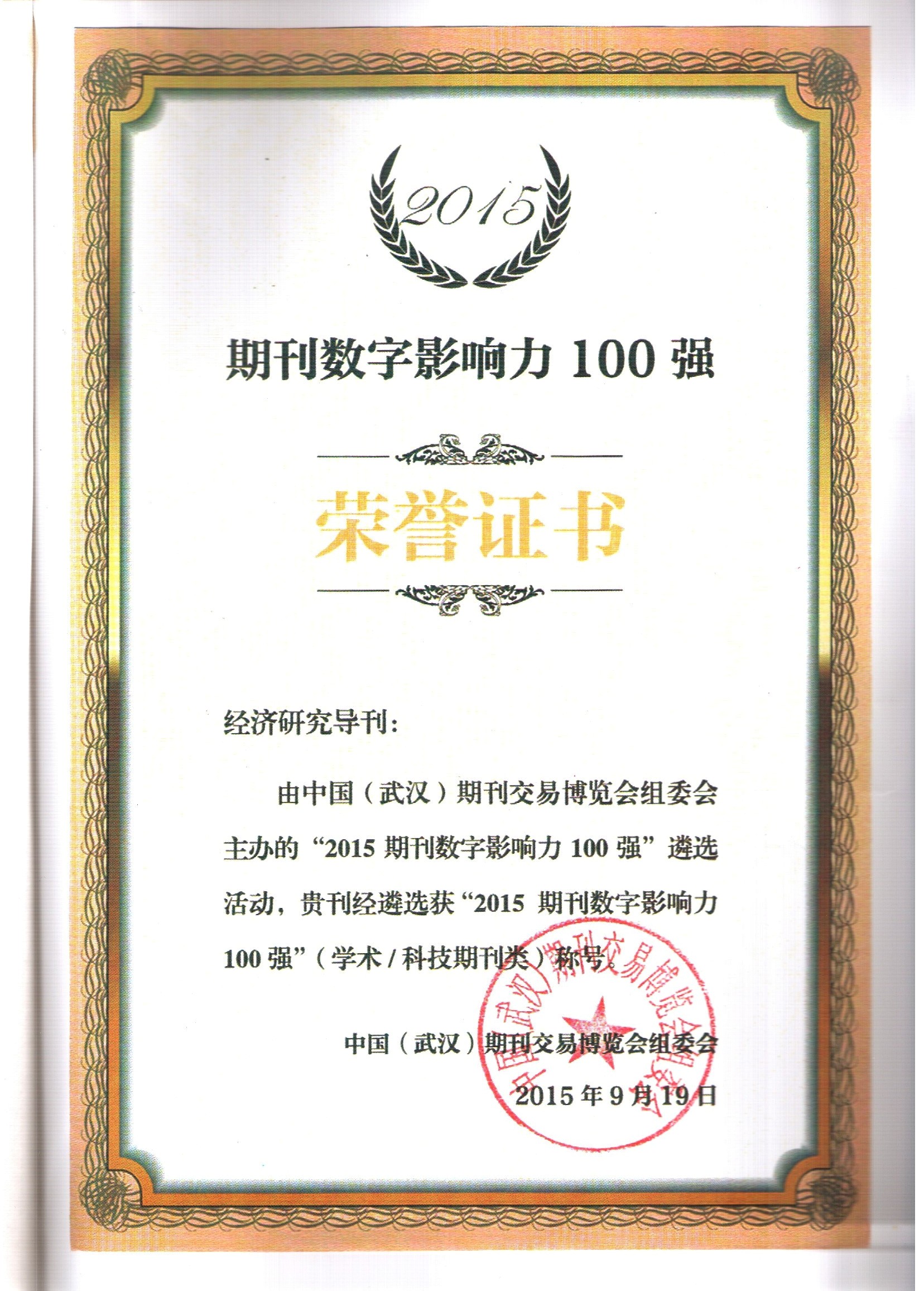 经济研究导刊五年影响因子0.332;2015秋季进入中国期刊数字100强!