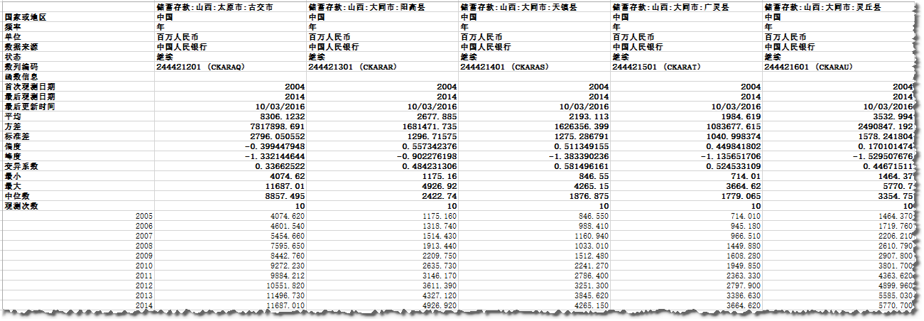全国3185个地级市、县、区居民储蓄银行存款数据:2005-2014