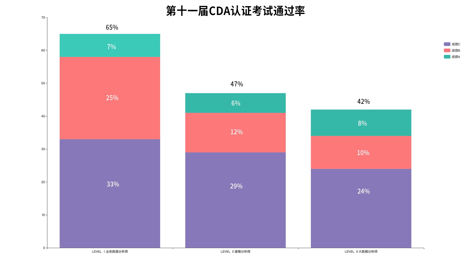 · LEVEL 1业务数据分析师通过率为65%(其中成绩A占比7%,成绩B占比25%,成绩C占比33%)