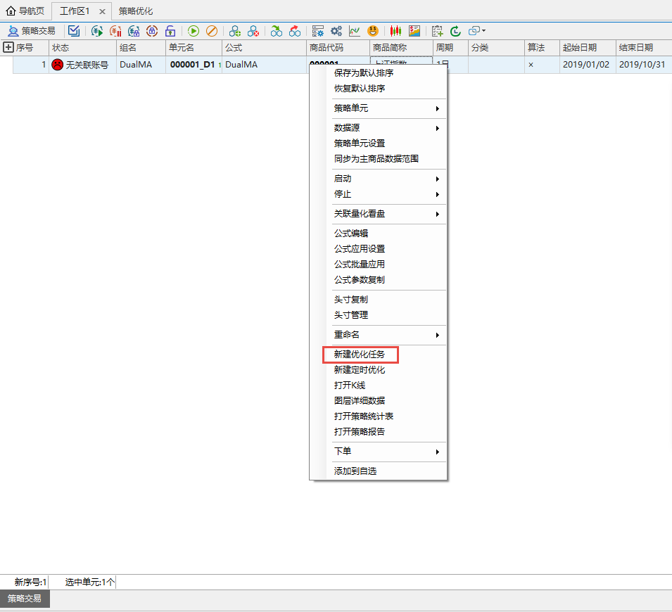 用户在策略交易中新建了一个策略单元,数据源是000001的日线,公式是系统公式dualma。选中策略单元右键选择新建优化任务。