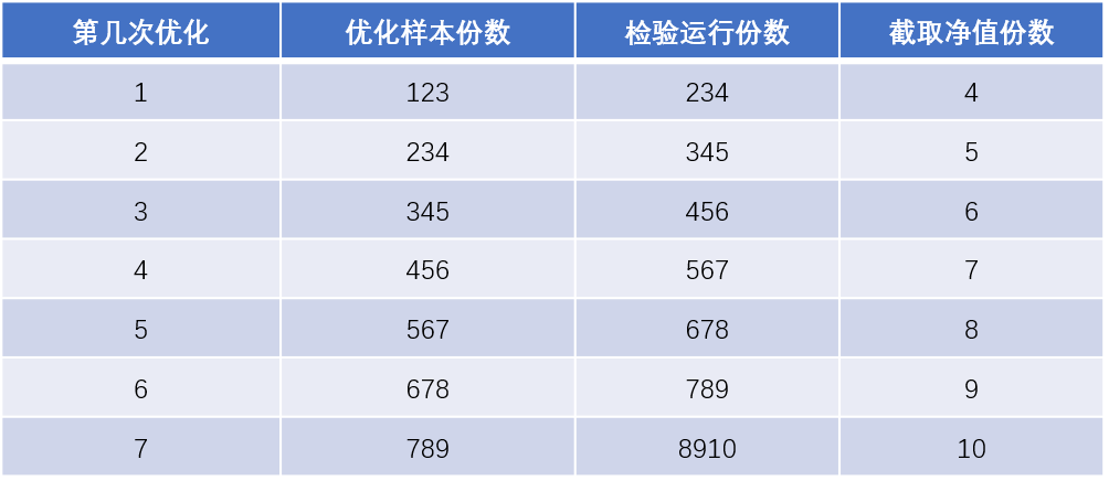 第一次优化时,优化样本则不是用设置的3份,而是截止到开始时间为止。所以优化样本只有两份,分别是2019/01/02-2019/01/31和2019/02/01-2019/02/11。而检验样本也不是3份,而是只取了接下来的一份,2019/02/11-2019/02/28。提取样本就直接提取了这一段2019/02/11-2019/02/28。