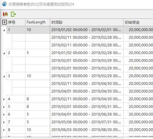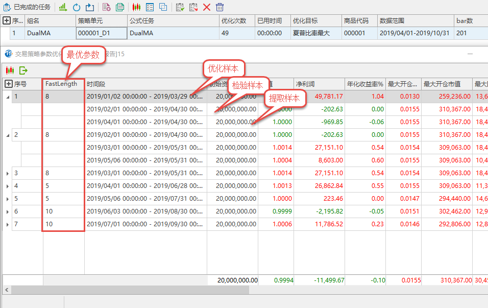 我们对双均线dualma优化第一个参数。数据源的时间为2019/01/01-2019/10/31。