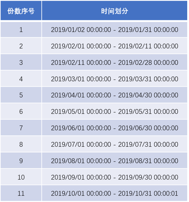 单位样本数:1月;这样样本每个自然月为一份,分割总份数为10份