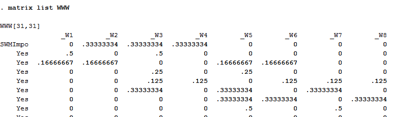 但权重矩阵WW是我国31各省的地理权重矩阵,是一个方阵啊,不知道为什么无法进行特征根矩阵的运算,所以也就无法做误差模型,已经卡了一个多星期了,向各位大神求助,非常感谢!!!