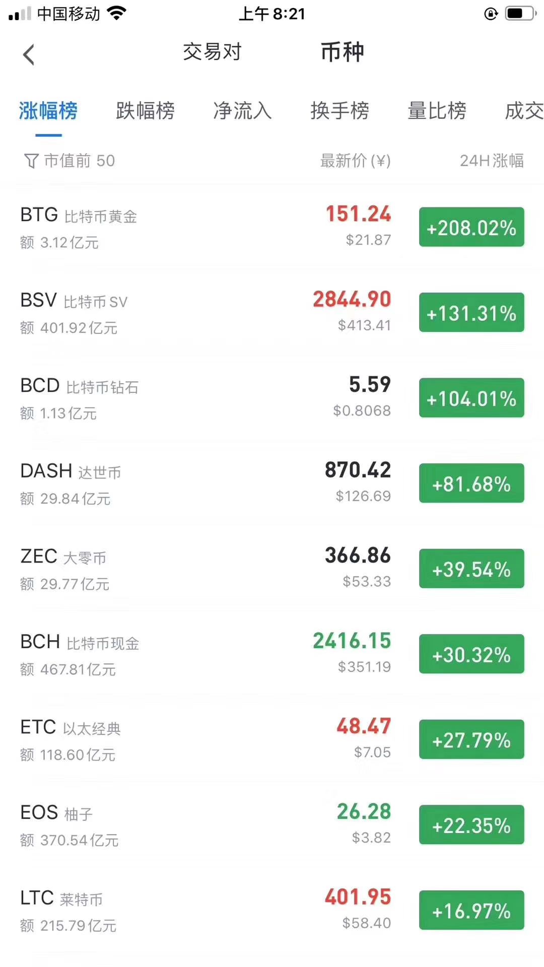 据了解,除了众人熟知的BCH和BSV外,涨幅前十的币种中,还包括了BTG(比特币黄金)、BCD(比特币钻石),而在减半行情的推动以及BSV的引领下,这两个币种也出现了翻倍行情,涨幅都超过了100%。