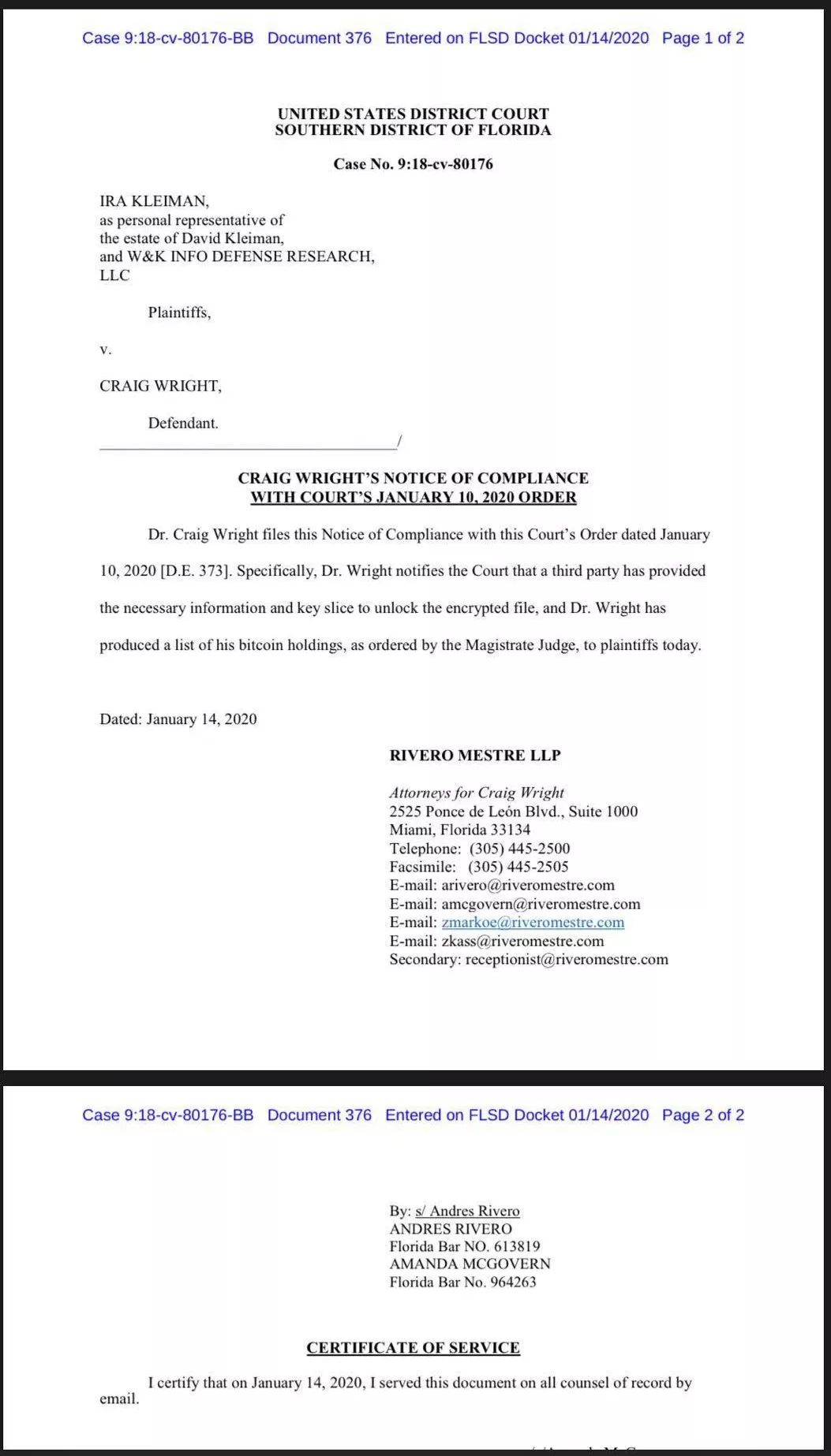 而在澳本聪提交这份文件过后,今日,据Ira Kleiman的律师称,澳本聪只提供了16404个比特币地址清单,但没有关于“保税快递”中间人(第三方)的信息。Ira Kleiman要求澳本聪在10天之内回应7条关于中间人的质询,之后原告将利用这些答复来获取有关“保税快递”中间人的信息。在此期间,原告正在请专家审查和分析这份清单。