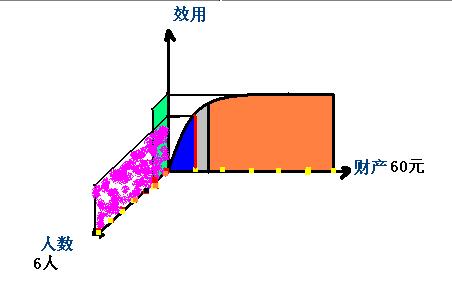 再看将60元的总财富平分给6个人是,对应 效用值 * 人数( 6人)的社会总效用为图中粉红色喷雾的面积