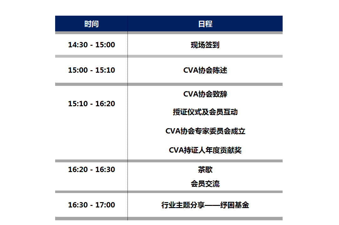 本次活动将在现场举办CVA持证人授证仪式以及由业内专家分享行业心得和看法。借此机会,我们希望提供一个良好的会员交流互动平台,为会员们搭建事业交流与沟通的桥梁。我们为您准备了舒适的下午茶和轻食,迎接您的到来。结识新朋友,联络老朋友,期待您的参加!