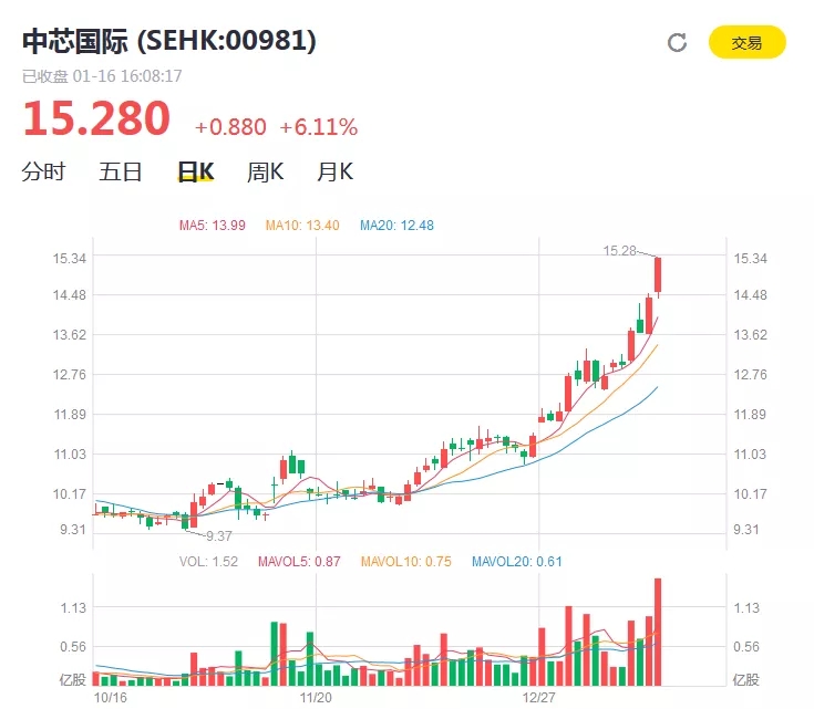 港股上市的中芯国际今天股价直接暴涨超6%,一天的市值增长就达44亿港币。