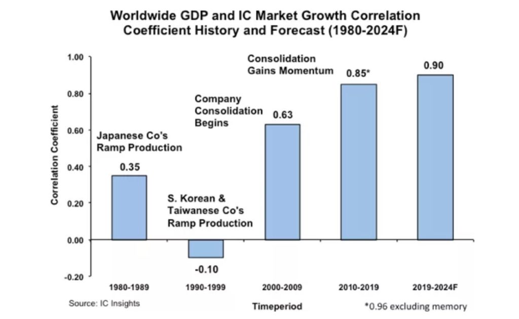 根據知名半導體分析機構《IC insights》的最新研究報告指出,半導體市場成長與全球 GDP 的成長之間關聯性愈來愈密切。同時,報告中還預測從現在到 2024 年的情況,也就是在未來幾年,報告中所體到的相關性將會進一步的提升。
