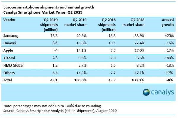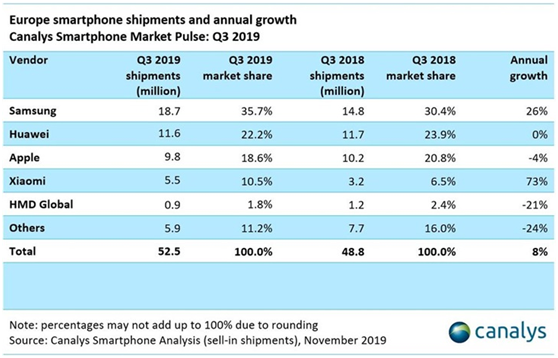 受“实体清单”禁令影响,华为手机在海外的发展开始受挫,其中尤以欧洲市场下滑较为严重。根据Canalys的调研数据,2019年第二季度,华为手机在欧洲的出货同比下滑16%至850万部。