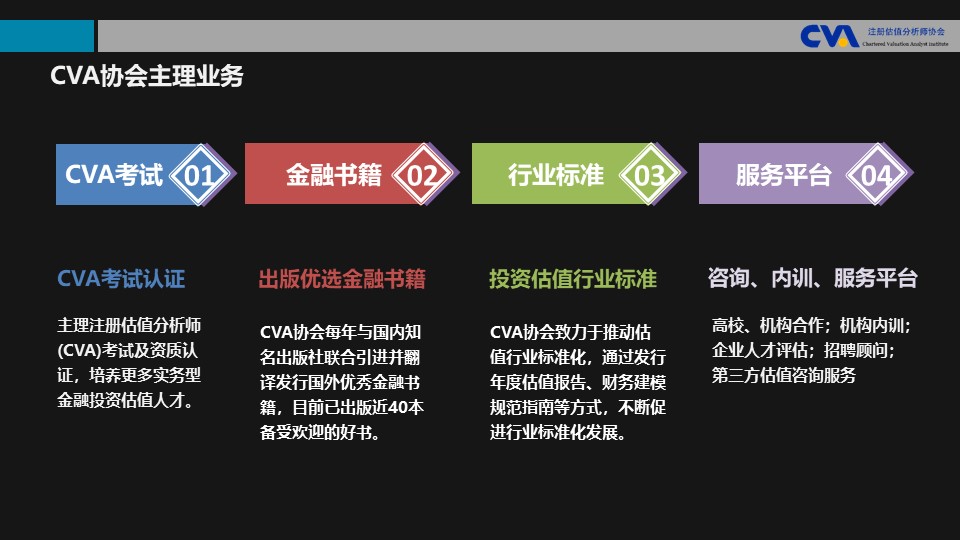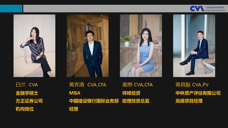 获得CVA持证人资质,不是终点,而是职业发展的又一个更好更高的起点。期待所有的持证人能够将CVA当成工作中的实用工具,而不仅仅是一纸证书,切实利用系统专业的估值方法,为自己和客户创造更大价值!